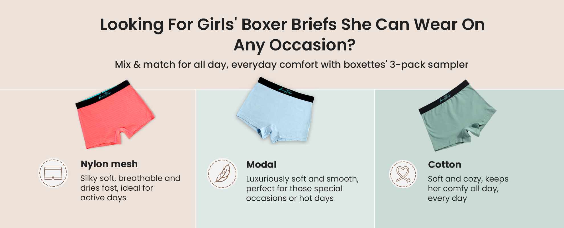 3-Parti Pack Girls Boxer Briefs Sampler (cotton, nylon mesh and modal)